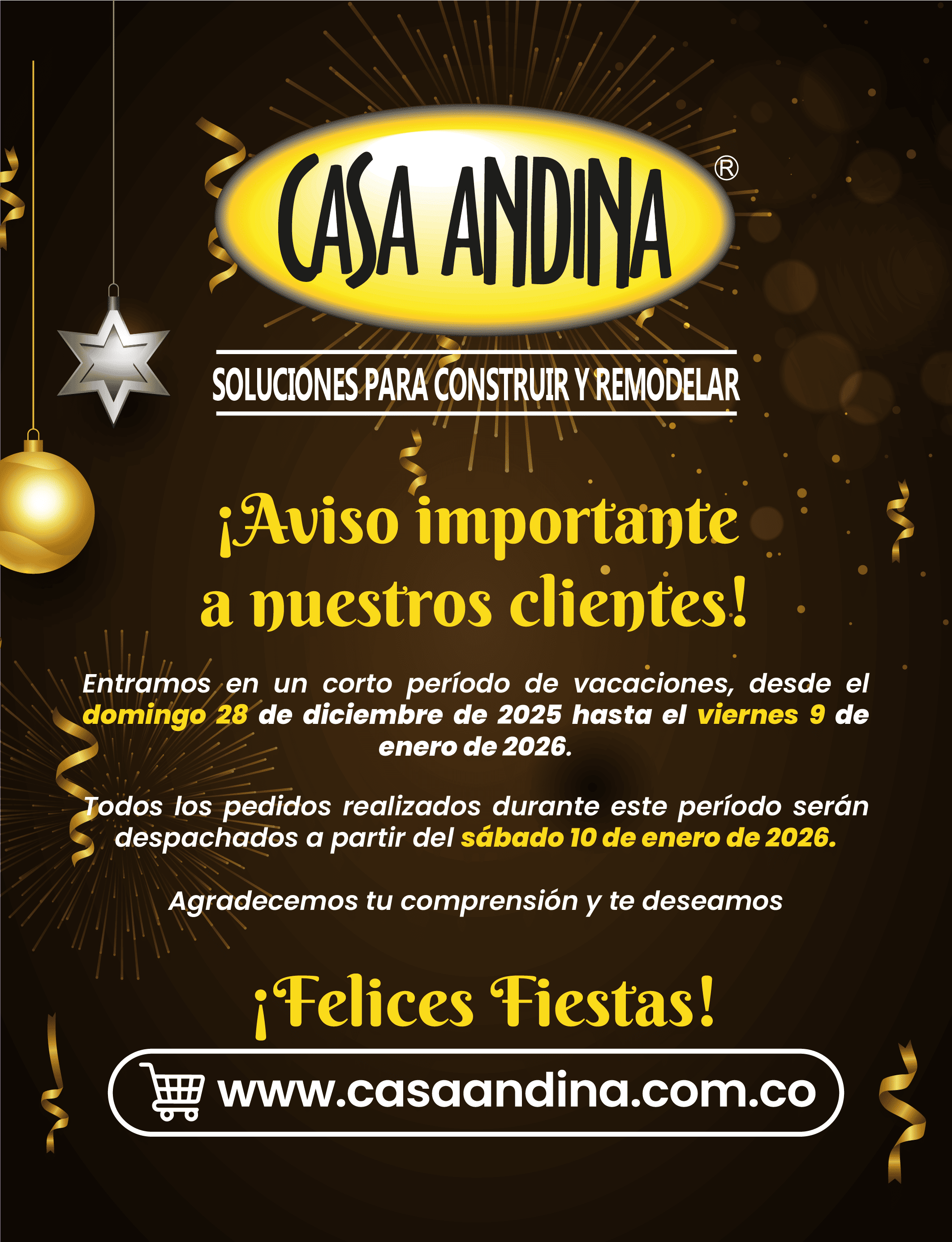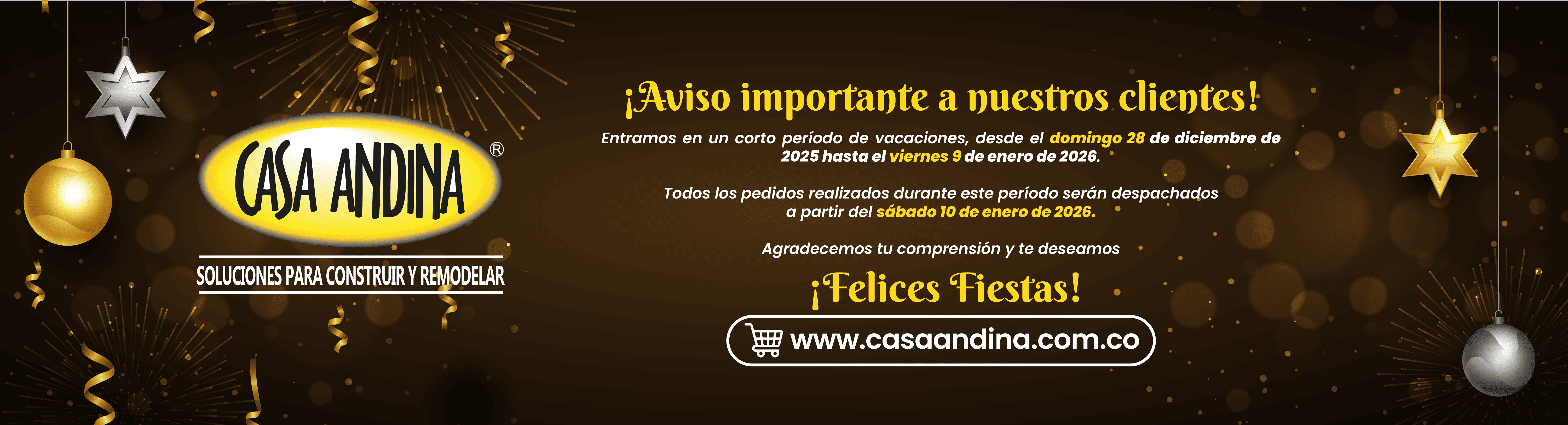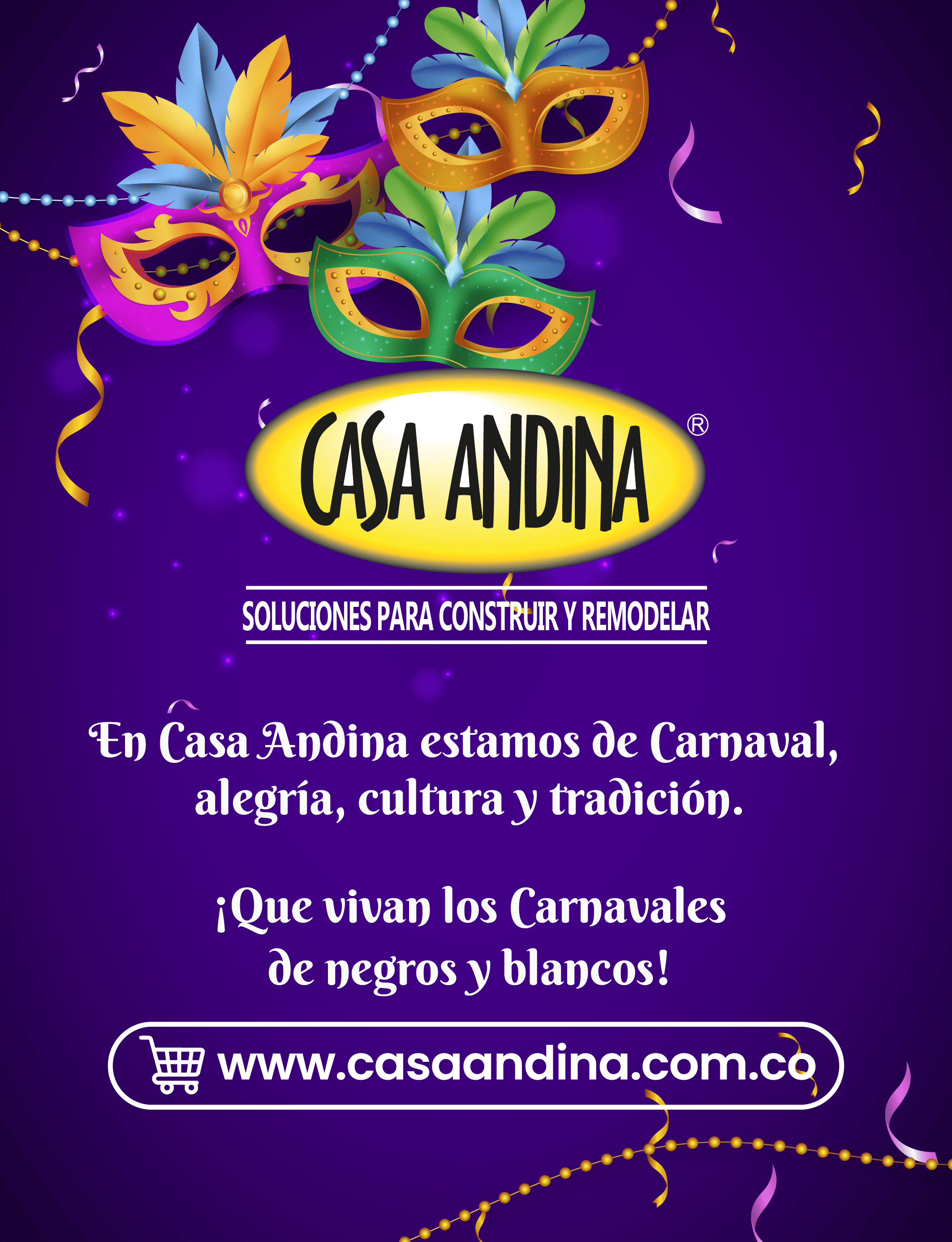 Entramos en un corto período de vacaciones. Del domingo 28 de diciembre de 2025 al viernes 9 de enero de 2026. Los pedidos se despacharán desde el sábado 10 de enero de 2026. ¡Felices Fiestas!... En Casa Andina celebramos el Carnaval de Negros y Blancos, Cultura, tradición y orgullo de nuestra tierra. ¡Que vivan los Carnavales!