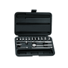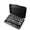 Incluye ratchet de cabeza redonda, extensiones, mango articulado, barra “T” deslizante, junta universal, 11 dados métricos y caja de almacenamiento.